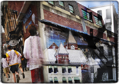 One of a series of city montages, this image conveys the feeling of a busy downtown area. From the college running team to the old abandoned building, the life of the city is portrayed. All shots with a Canon Powershot SD950 camera in Morgantown, WV.