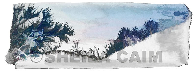 A panaramic digital sketch/watercolor of an infrared shot of a wooded area near sunset. Shot with a Canon Powershot G3 camera.